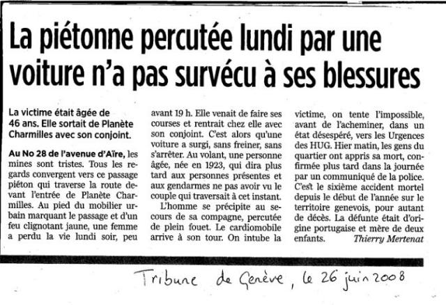 En hommage à Maria PERREIRA décédée suite à un accident survenu sur le passage piéton situé à l’Avenue d’Aïre à la hauteur du centre commercial de "Planète Charmilles" le lundi 23 juin dernier.