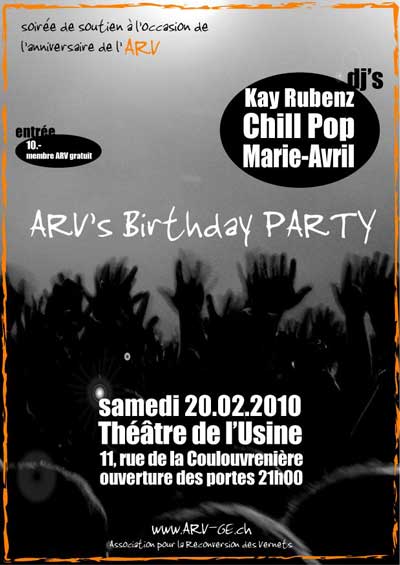 Après un an d’existence l’association pour la reconversion des Vernets (ARV) a le plaisir de vous convier à son anniversaire. Nous espérons donc vous rencontrer à cette occasion et ce dans une ambiance musicale contrastée et embrasée…