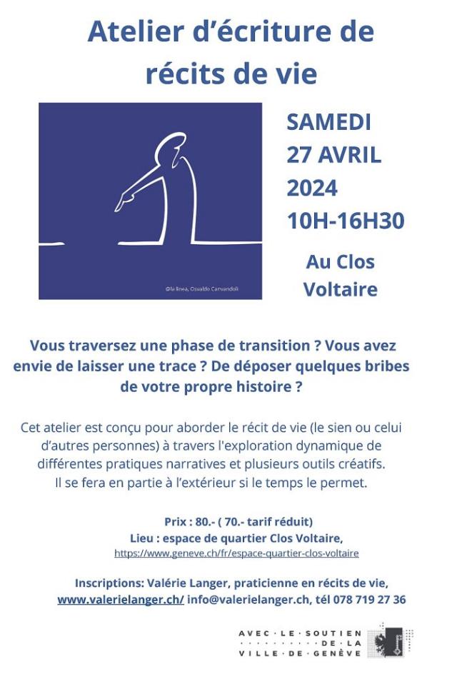 Renseignements : Valérie Langer, www.valerielanger.ch, email : info@valerielanger.ch, tél. 078 719 27 36.