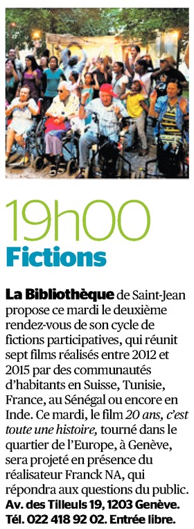 La Bibliothèque de Saint-Jean propose ce mardi le deuxième rendez-vous de son cycle de fictions participatives, qui réunit sept films réalisés entre 2012 et 2015 par des communautés d’habitants en Suisse, Tunisie, France, au Sénégal ou encore en Inde.