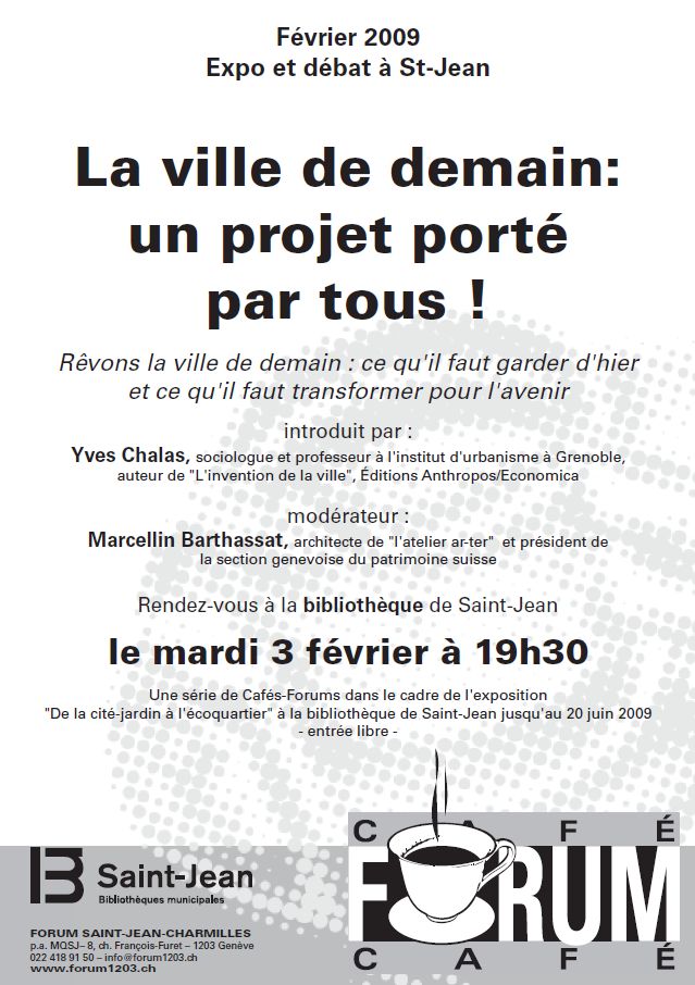 Mardi 3 février 2009, le premier des cinq cafés-forums de l’exposition « de la cité-jardin à l’écoquartier » s’est déroulé en présence d’une quarantaine de personnes à la bibliothèque de St-Jean. Après une mise en contexte de Marcellin Barthassat, qui a accepté généreusement de modérer ce débat, la conférence d’Yves Chalas sur l’urbanisme participatif a su attirer l’attention du public, qui l’a chaleureusement remercié pour sa capacité à vulgariser ce sujet de haut vol.