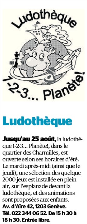 Jusqu’au 25 août, la ludothèque 1-2-3… Planète !, dans le quartier des Charmilles, est ouverte selon ses horaires d’été