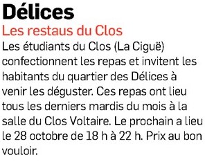 Ces repas ont lieu tous les derniers mardis du mois à la salle du Clos Voltaire. Le prochain a lieu le 28 octobre de 18 h à 22 h. Prix au bon vouloir