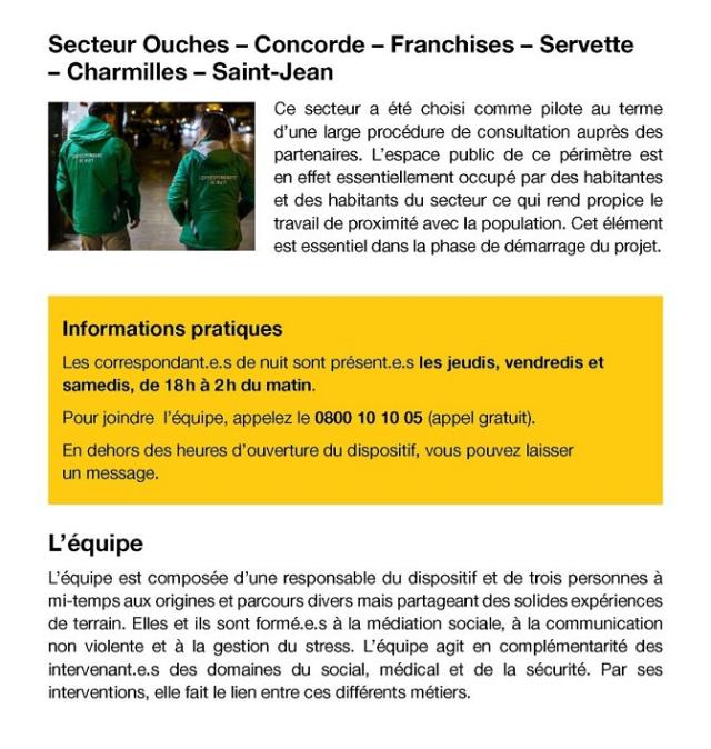 Les Correspondant-e-s de nuit, rattaché-e-s au Service de la jeunesse, ont pour mission de promouvoir la convivialité et le vivre ensemble. Par leur présence sur l’espace public, elles et ils contribuent à :