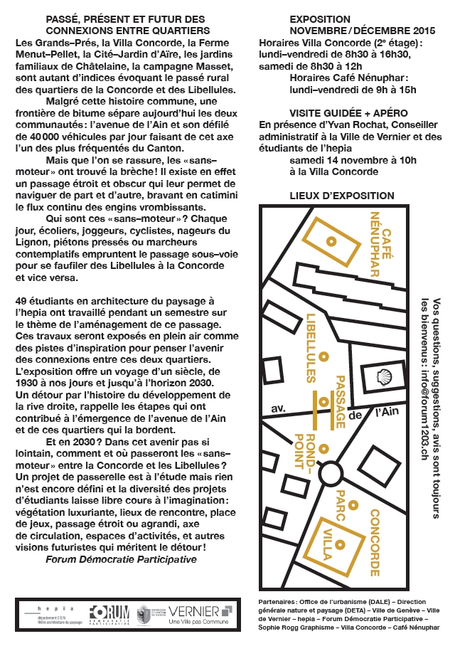 En 2015, 49 étudiants en architecture du paysage à l’hepia ont travaillé pendant un semestre sur le thème de l’aménagement de ce passage. Ces travaux seront exposés en plein air comme des pistes d’inspiration pour penser l’avenir des connexions entre ces deux quartiers.