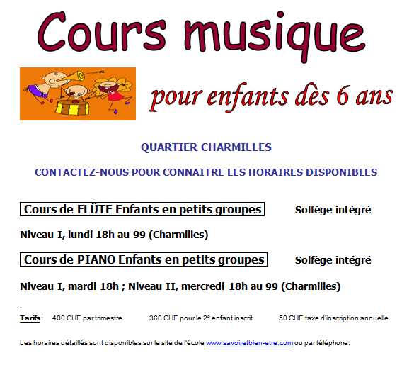 Exploration musicale pour les petits de 18 mois à 3 ans accompagnés d’un adulte. Éveil musical pour les enfants de 3 à 5 (ou 6) ans. Piano et flûte (solfège intégré) en petits groupes pour les enfants dès 6 ans.