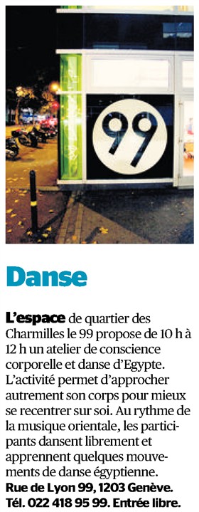 L’espace de quartier des Charmilles le 99 propose de 10 h à 12 h un atelier de conscience corporelle et danse d’Égypte