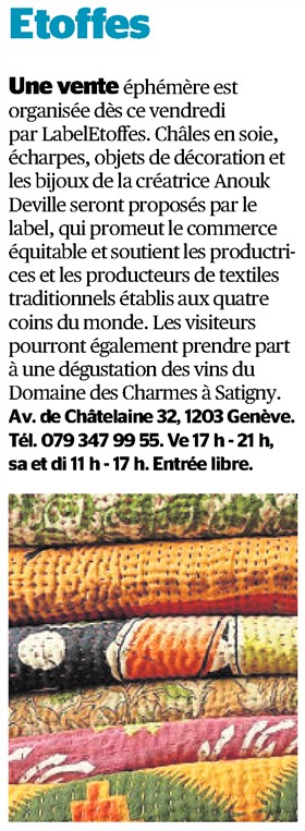 Étoffes Vente | Tribune de Genève | Vendredi 9 mai 2014 | Suivez le guide | Séverine Géroudet et Gabrielle Cottier | page 34