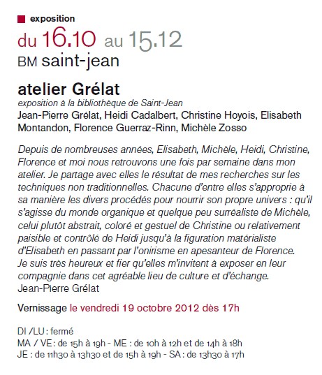 Du 16 octobre au 15 décembre 2012, la bibliothèque de Saint-Jean accueille l’atelier Grélat. Vernissage le vendredi 19 octobre dès 17h.