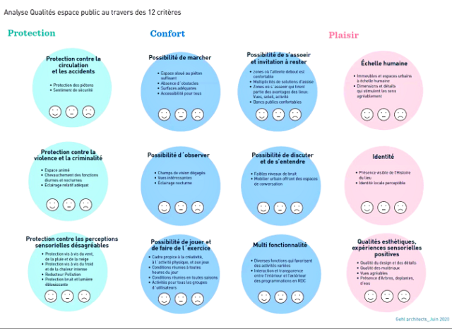 La deuxième démarche consiste analyser chacun des secteurs sur la base de 12 critères. Une analyse cartographique permet d’évaluer la qualité des façades, des trottoirs, la localisation des bancs et flux principaux.