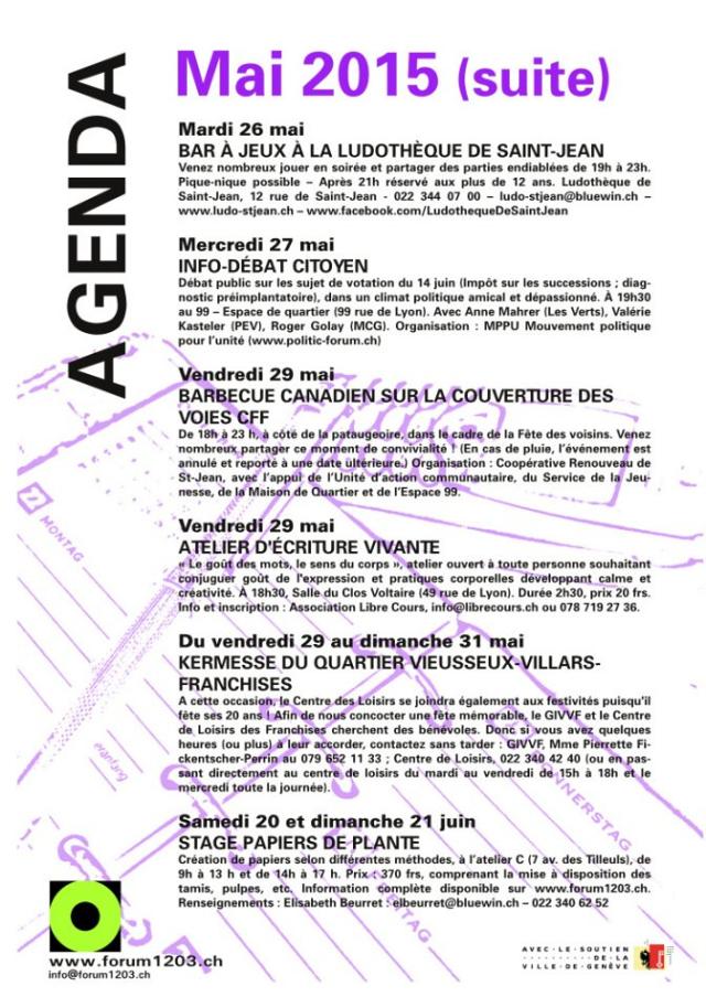 Soirée forum sur les jardins partagés, contes pour enfants, Marché Galiffe, débat citoyen sur les votations, barbecue canadien sur la couverture des voies, projet de potager urbain à Saint-Jean, appels à bénévoles, stages et ateliers, etc... Avec une version à télécharger et afficher en pièce jointe.