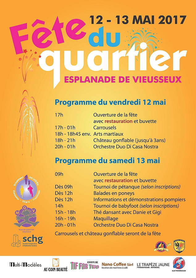 Vendredi 12 et samedi 13 mai, fête du quartier sur l’esplanade de Vieusseux : carrousels, buvette et restauration, bals, tournois de pétanque et de baby-foot, balades en poney, thé dansant, etc.
