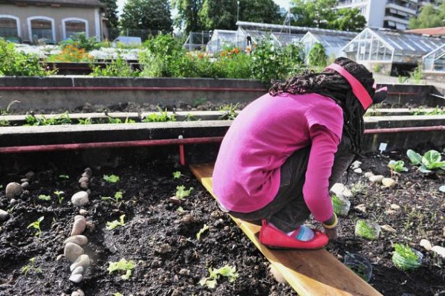 09/05/2014. Genève. Eco-quartiers. Un secteur du Parc Beaulieu est reservé aux jardins familiaux, parascolaires et associatifs. Valérie est animatrice du para-scolaire. Pierre Abensur/Tamedia