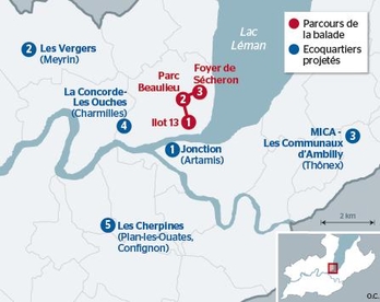 Parcours de la balade : — Ilot 13 (1) — Parc Beaulieu (2) — Foyer de Sécheron (3) Écoquartiers projetés : — Jonction (Artamis) (1) — Les Vergers (Meyrin) (2) — MICA - Les Communaux d’Ambilly (Thônex) (3) — La Concorde / Les Ouches (Charmilles)(4) — Les Cherpines (Plan-les-Ouates, Confignon) (5)