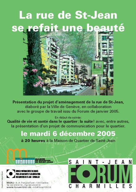 Rue de ST-Jean et PLQ : la construction de nouveaux logements, d’une crèche et de lofts, une végétation en souffrance, ainsi que la mise en place d’une zone 30km/h, rendent indispensable de réaménager la rue de Saint-Jean. La Ville de Genève et les architectes mandataires présenteront aux habitants le projet d’aménagement élaboré en collaboration avec le groupe de travail issu du Forum de janvier 2005. L’étape suivante reviendra au Conseil Municipal, qui devra voter un crédit d’aménagement sur la base de ce projet qui lui sera soumis très prochainement.