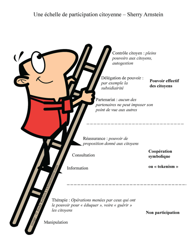 En haut figurent trois niveaux de participation véritable : le partenariat, où la prise de décision se fait au travers d’une négociation entre les pouvoirs publics et les citoyens, la délégation de pouvoir, dans lequel l’instance centrale délègue à la communauté locale le pouvoir de prendre certaines décisions au cours d’un processus, et tout en haut le contrôle citoyen, lorsque tous les aspects essentiels sont entre les mains des habitant·e·s, par ex pour la réalisation d’un projet ou la gestion d’un équipement.