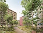 Le rehaussement s’inspire de l’existant, tant pour la couleur rouge que pour la structure des façades. Le but avec des pièces en enfilade est d’amener la lumière au cœur des logements, et que tous bénéficient avec les balcons, d’un espace extérieur donnant sur le parc. Le revêtement de la façade du côté des balcons est en bois. En augmentant de deux étages, et en élargissant avec les balcons, les proportions des immeubles sont conservées.