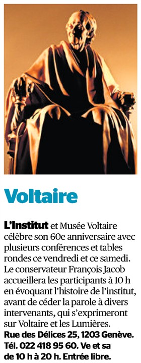 Le conservateur François Jacob accueillera les participants à 10 h en évoquant l’histoire de l’institut, avant de céder la parole à divers intervenants, qui s’exprimeront sur Voltaire et les Lumières.