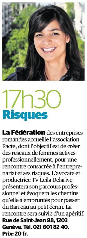La Fédération des entreprises romandes (FER) accueille l’association Pacte, dont l’objectif est de créer des réseaux de femmes actives professionnellement, pour une rencontre consacrée à l’entreprenariat et ses risques
