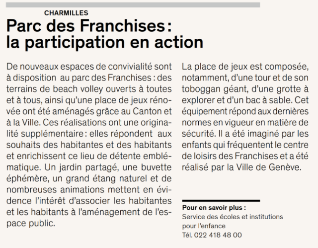 Accueil > Revue de presse > Vivre à Genève > Parc des Franchises : la participation en action
