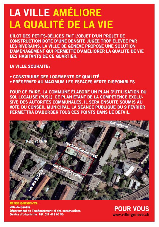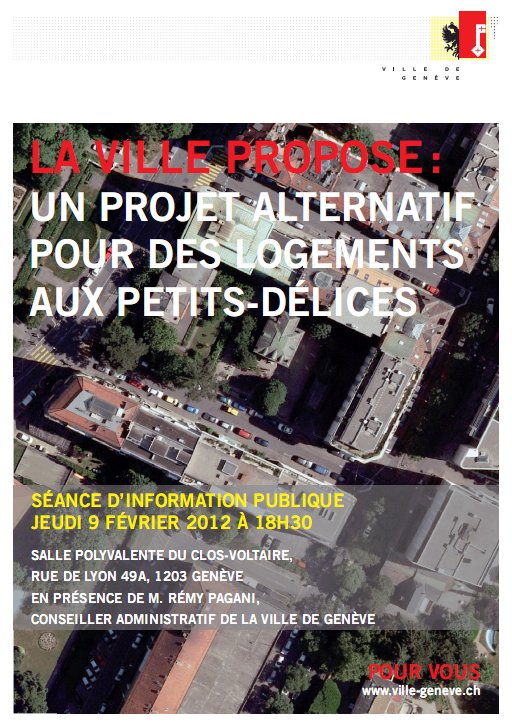 La Ville de Genève organise une séance d’information publique de présentation du Plan d’utilisation du sol (PUS) du secteur des Délices, initié par le Département des constructions et de l’aménagement.