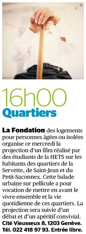 L’Unité d’Action Communautaire Servette - Saint-Jean - Charmilles, en collaboration avec l’HETS (Haute Ecole en Travail Social), vous invite à la diffusion du documentaire :