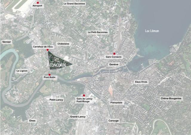 La Concorde occupe une position remarquable au carrefour de plusieurs quartiers. Situé à cheval sur les communes de Genève et Vernier, ce secteur de l’ouest de l’agglomération représente historiquement la limite entre le centre-ville et la périphérie. Aujourd’hui, il est particulièrement dynamique et il bénéficiera, à moyen terme, d’une accessibilité renforcée des transports en commun, avec la future halte RER de Châtelaine.