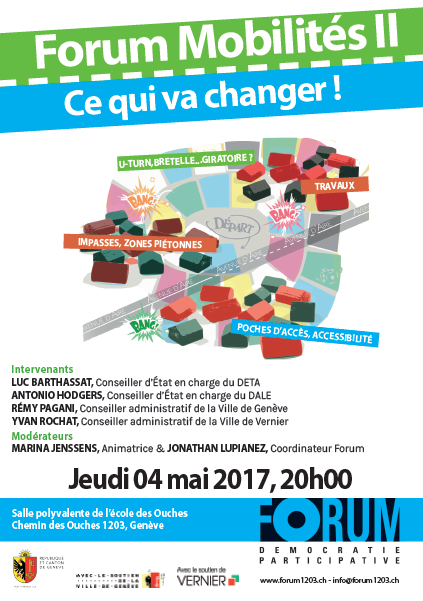 Tandis que le premier volet sur la mobilité s’était déroulé sous la forme d’un atelier, le deuxième forum, consacré aux questions de mobilité et d’aménagement routier du quartier de la Concorde, a eu lieu le 4 mai 2017, sous la forme d’un débat public avec les magistrats du Canton et des Villes en charge de ce domaine.