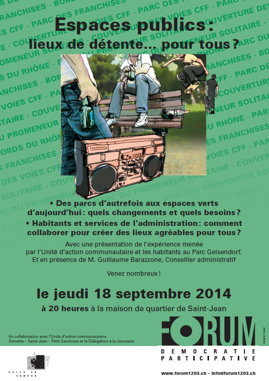 Le Forum Démocratie participative Saint-Jean – Charmilles vous invite à une soirée débat sur les espaces publics de détente dans le quartier (parcs du Promeneur solitaire et des Franchises, couverture des voies CFF, bords du Rhône (zone du Sous-Cayla).
