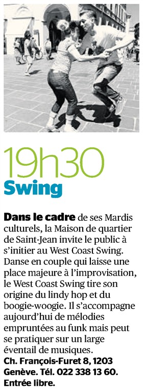 Swing Saint-Jean | Tribune de Genève | Mardi 28 octobre 2014 | Suivez le guide | Séverine Géroudet et Anne Maron | page 30
