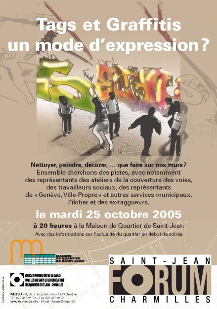Je trouverais particulièrement intéressant d’ouvrir cette réflexion aux principaux intéressées, aux taggueurs/taggueuses actuels et futurs taggueurs potentiels, à savoir nos enfants, je reste persuadée qu’une sensibilisation aux problématiques des uns et des autres ainsi que des propositions créatives pourraient en découler. Malheureusement l’heure prévue ne s’y prête guère et annonce surtout un débat d’adultes. J’aurais souhaité un débat/atelier/table ronde le mercredi après-midi ou le samedi matin par exemple,