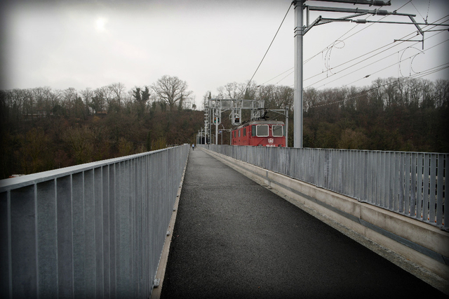 « Le viaduc de la Jonction franchit en trois arches les eaux claires du Rhône et celles, limoneuses, de l’Arve. Il donne à voir un paysage unique, à la fois urbain et naturel, classé à l’inventaire fédéral des paysages. Seule séquence suspendue de la Voie verte, la passerelle piétonne et cyclable, aménagée en 2017, se trouve sur le parcours de mobilité douce transfrontalier qui traverse le Canton de Genève. »