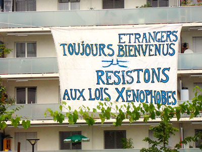 Un collectif d’habitants de Genève, membre de l’Association des Zabouches, tient à marquer son désaccord et son mécontentement après le résultat de la votation de dimanche concernant les lois sur l’asile et les étrangers. Depuis lundi, une banderole flottant entre les deux immeubles des 14 et 16 chemin des Ouches, affirme : « Etrangers toujours bienvenus. Résistons aux lois xénophobes ». Ce slogan est complété par un logo stylisé bleu sur fond blanc représentant deux barques reliées par une corde. Au centre se dessine un A comme asile ou accueil.