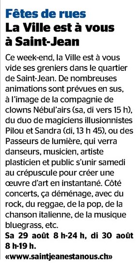 Ce week-end, la Ville est à vous vide ses greniers dans le quartier de Saint-Jean. De nombreuses animations sont prévues en sus, à l’image de la compagnie de clowns Nébul’airs (sa, di vers 15 h), du duo de magiciens illusionnistes Pilou et Sandra (di, 13 h 45), ou des Passeurs de lumière, qui verra danseurs, musicien, artiste plasticien et public s’unir samedi au crépuscule pour créer une œuvre d’art en instantané. Côté concerts, ça déménage, avec du rock, du reggae, de la pop, de la chanson italienne, de la musique bluegrass, etc.